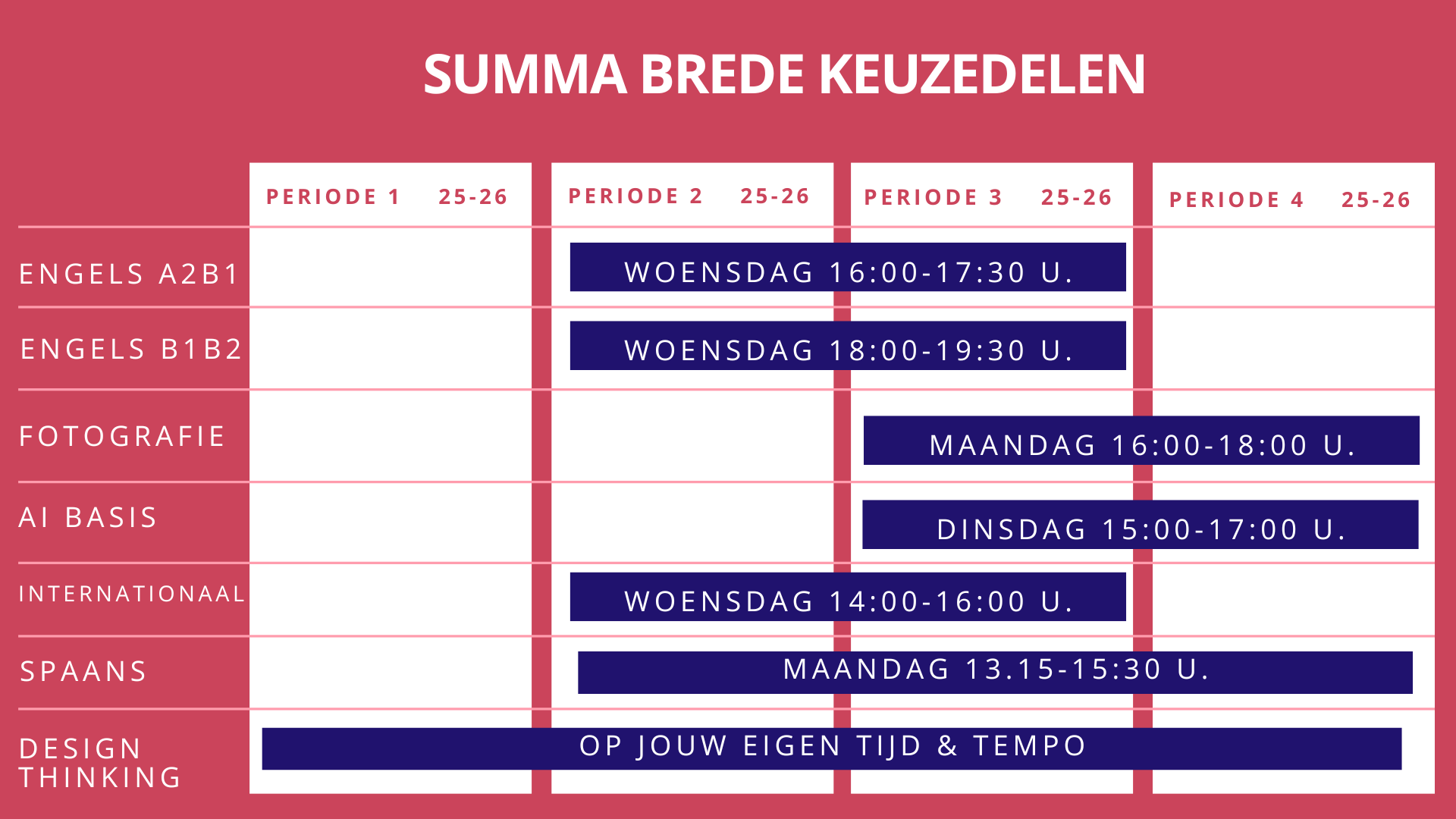 Onderstaand zie je alle keuzedelen die Summa aanbiedt. Er kunnen tussentijds wijzigingen plaatsvinden, dus check altijd even je studiecoach. Wil je meer weten over een bepaald keuzedeel, ook dan moet je bij je studiecoach zijn.